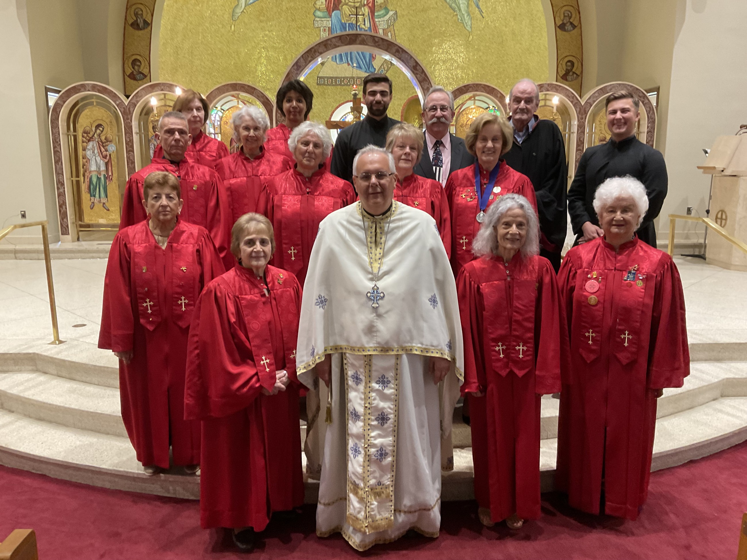 Front row: Renee Root (Director), Fr. George Chioros, Connie Anastasiou (Organist), Jim Bostaph (Organist)